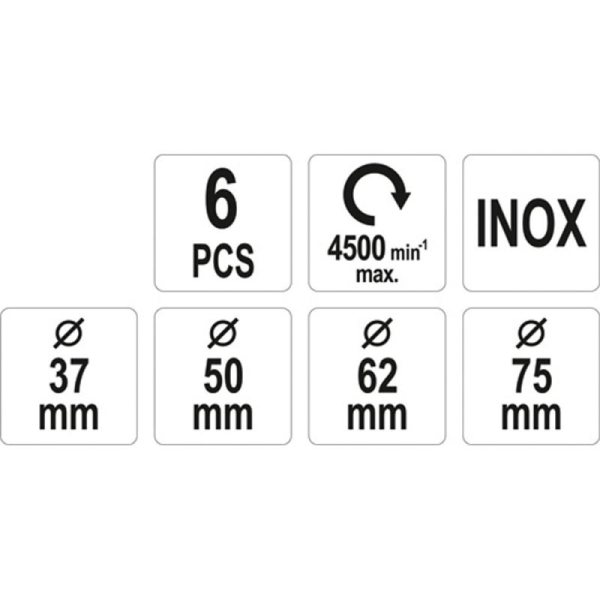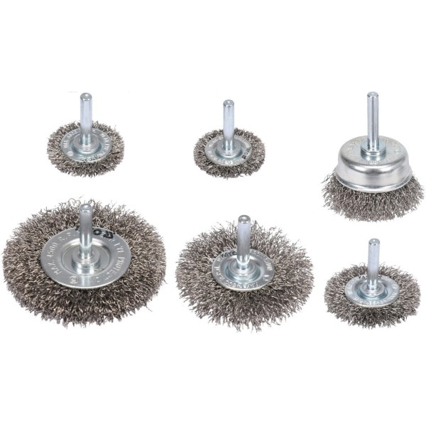 Σετ 6 συρματόβουρτσες ατσάλινες δραπάνου με άξονα κατάλληλο για χρήση σε μέταλο για την αφαίρεση σκουριάς και σαθρών στρωμάτων μπογιάς.