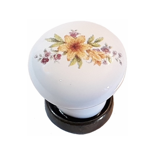 Πόμολα Επίπλων Πορσελάνης Λευκή Λουλούδια Βάση Χρυσό Αντικέ 20mm MG37409