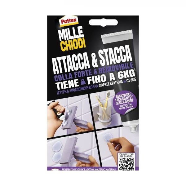 Pattex Attaca e Stacca is an innovative adhesive that offers a unique feature: the ability to be easily and cleanly removed without leaving any residue. It's perfect for a variety of applications around the home, office, or workspace where a temporary or reversible bond is needed.