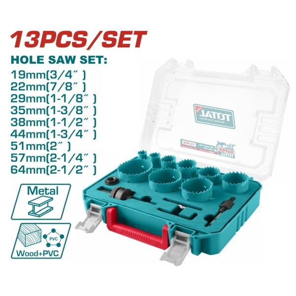 Home     Tools Accessories     HSS Bi-Metal Hole Saws   TOTAL Bi-metal hole saw set 13pcs (TACSH0132)