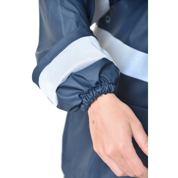 Αδιάβροχη στολή PU σε μπλε χρώμα (σακάκι & παντελόνι) με κολλημένες ραφές, ανακλαστικές ταινίες και αποσπώμενη κουκούλα. Ελαφριά, εύκαμπτη και ιδανική για προστασία από βροχή.